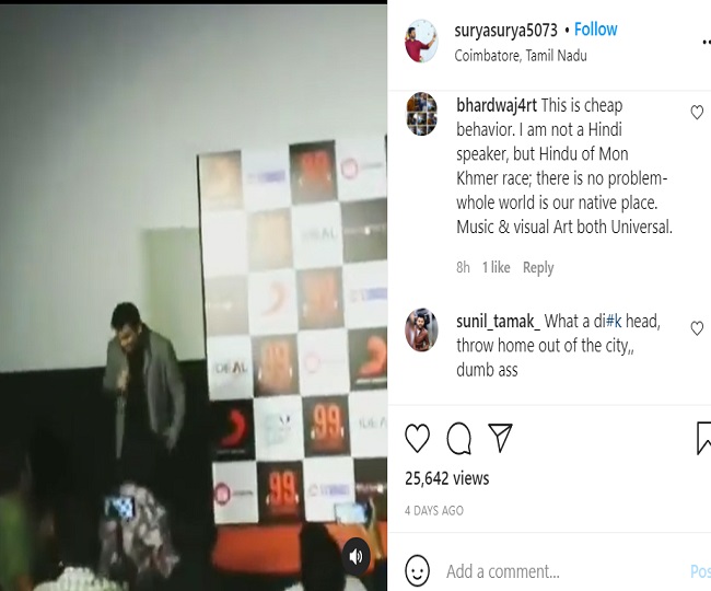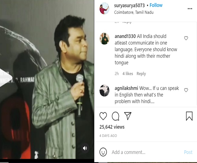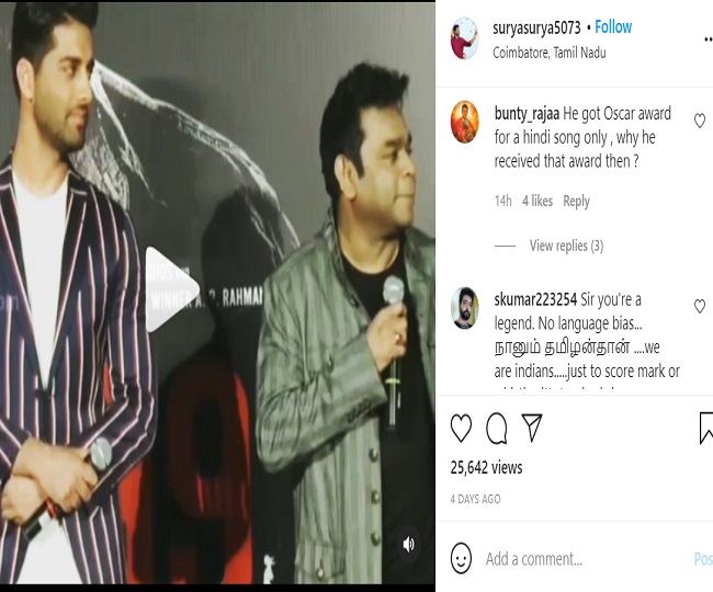 हुआ यूं कि प्रमोशन इवेंट में एंकर्स तमिल भाषा में सवाल पूछ रहे थे। इस दौरान एक एंकर ने हिंदी में बात की और हिंदी सुनकर सिंगर चौंक गए और मज़ाक में स्टेज से उतरकर चले गए। हालांकि स्टेज से उतरते हुए ए.आर. रहमान ने ये साफ कर दिया कि वो सिर्फ मज़ाक कर रहे हैं लेकिन उनका ये मज़ाक लोगों को बिल्कुल पसंद नहीं आया और उन्होंने इसे हिंदी भाषा का अपमान बताया है। सिंगर का ये वीडियो सोशल मीडिया पर काफी वायरल हो रहा है जिसे देखकर लोग तरह-तरह के कमेंट कर अपना गुस्सा ज़ाहिर कर रहे हैं।