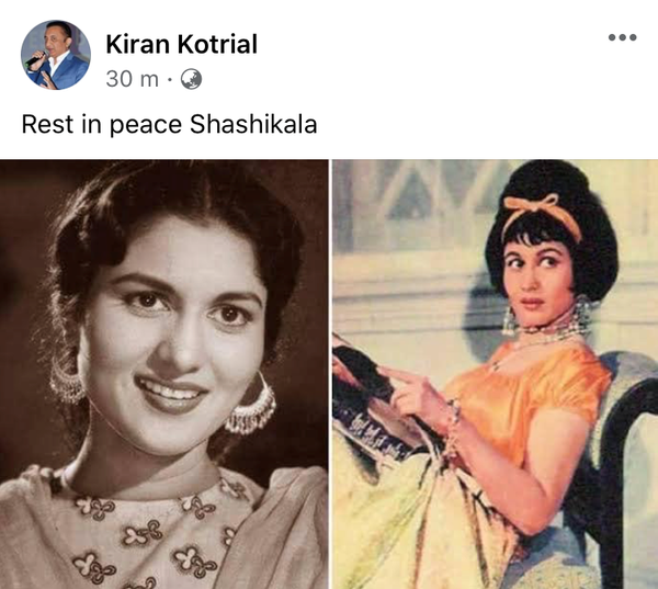 गुजरे जमाने की मशहूर एक्ट्रेस शशिकला का 4 अप्रैल को 88 साल की उम्र में मुंबई में निधन हो गया। उनके निधन की खबर राइटर किरन कोट्रियाल ने सोशल मीडिया पर शेयर की है। 100 से ज्यादा फिल्मों में सपोर्टिंग रोल निभा चुकीं शशिकला का जन्म 4 अगस्त 1932 में महाराष्ट्र के सोलापुर में हुआ था। हलाांकि अभी शशिकला के परिवार की ओर से उनके निधन की कोई जानकारी नहीं दी गई है।
