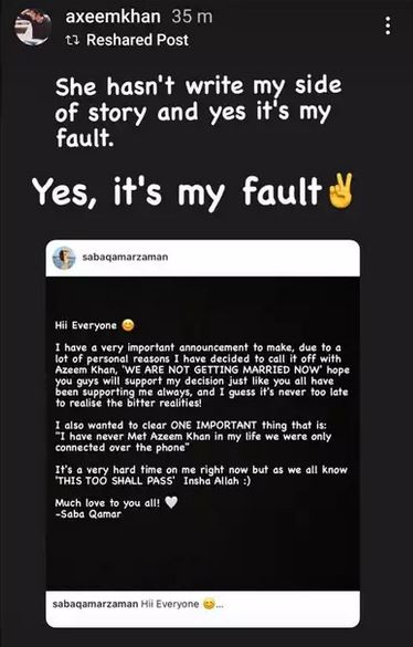 सबा के इस पोस्ट पर अजीम खान का भी रिएक्शन सामने आया है। उन्होंने सबा के पोस्ट को शेयर करते हुए लिखा, 'उसने अपनी स्टोरी में मेरा पक्ष नहीं लिखा और हां मेरी गलती है। हां मेरी गलती है।'