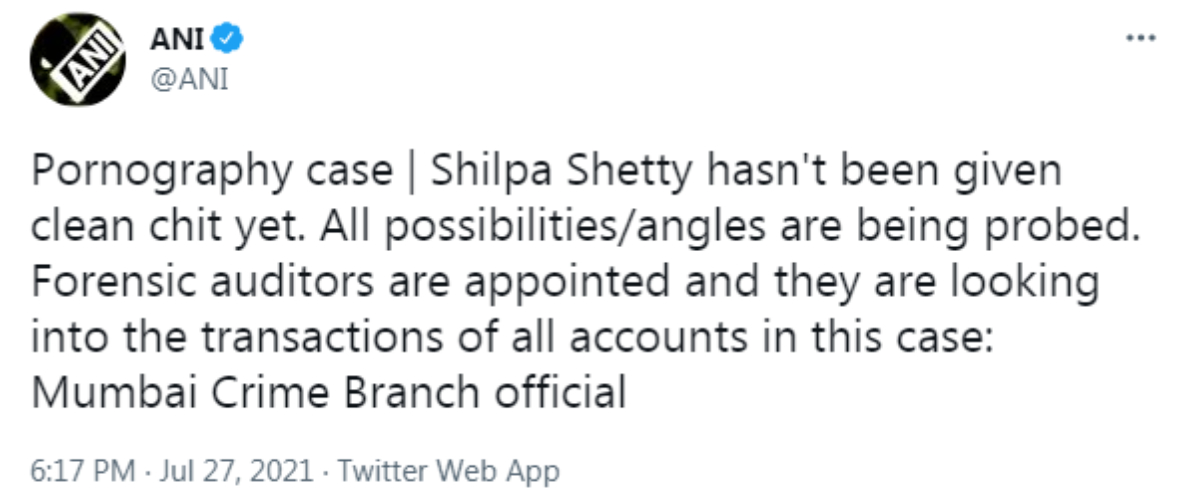 एएनआई के मुताबिक, मंगलवार को क्राइम ब्रांच के अधिकारियों ने बताया कि शिल्पा को अभी इस मामले में क्लीन चिट नहीं दी गयी है। सभी सम्भव एंगल से केस की जांच की जा रही है। फॉरेंसिक ऑडिटर्स खातों की जांच कर रहे हैं और वो इस केस से जुड़े सभी खातों में हुए लेन-देन की जांच कर रहे हैं।